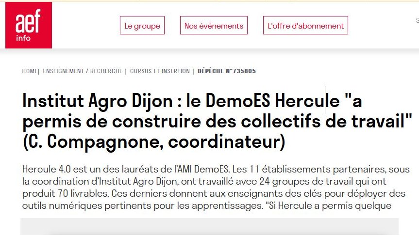 Dans l'article intitulé “ Institut Agro Dijon : le DemoES Hercule « a permis de construire des collectifs de travail » ”, Claude Compagnone raconte la collaboration entre les 11 établissements membres d'Hercule, les défis et les opportunités que cela suppose. Il évoque la variété des livrables produits par les groupes de travail, mais également l'après-Hercule et la volonté de maintenir un réseau inter-établissements après la fin du projet.